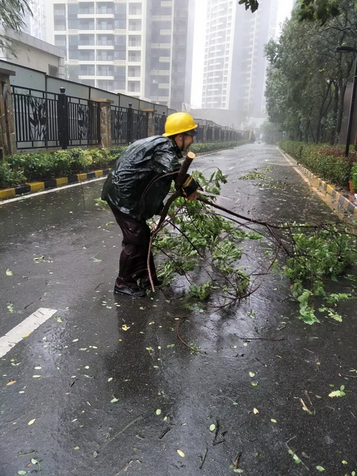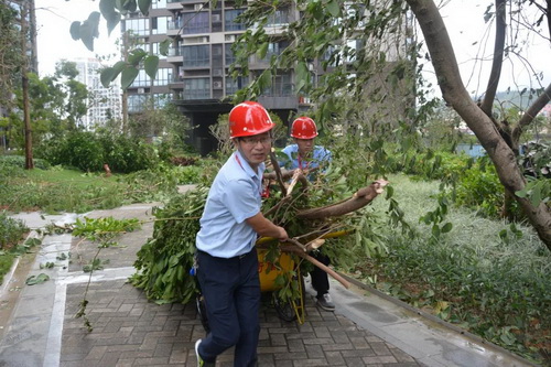 物业本部职能部门全体人员分批到达各楼盘园区,协助各服务中心清理路障,运输段残枝叶工作。