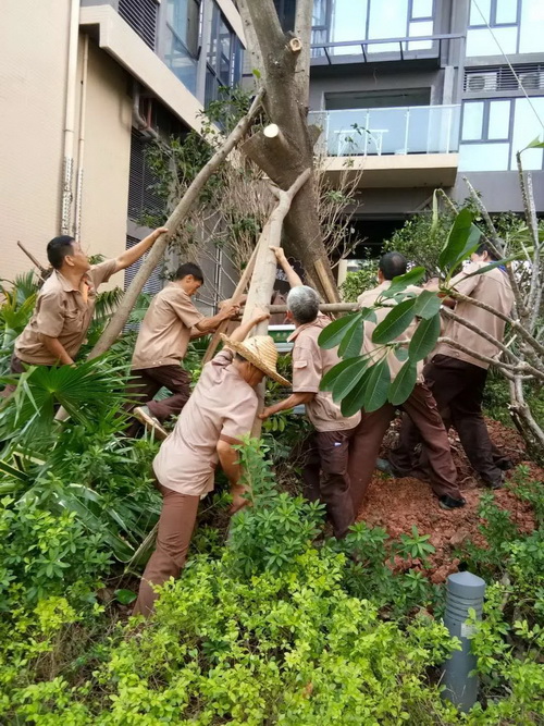 硬件设备设施修复后可短时间内恢复回正常使用状态中。但“软性”设施,养植千日,山竹无情肆虐扫荡,只有重新投入更大的精力,用心栽培与照料,那一大片被肆虐后的生命才能慢慢复原生机。为家园还原一片具有生命活力的绿色氧吧,颐安物业人一直在努力。