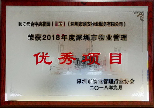2018年9月6日,深圳市颐安物业服务有限公司都会中央花园(Ⅱ区)荣获“2018年度深圳市物业管理优秀项目”称号。