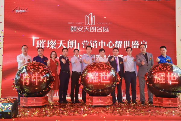 在所有来宾的见证下,颐安集团的领导们上台一起启动彩球,礼炮齐鸣,响彻云霄,颐安天朗名庭营销中心正式开放。