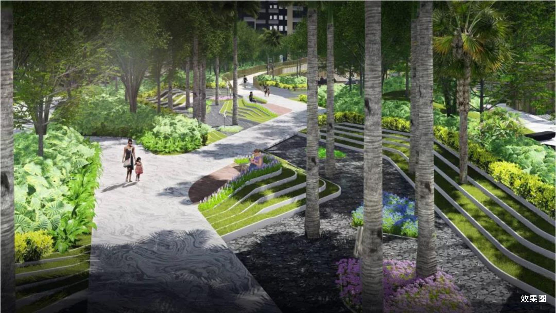 通过规整的铺装椰林按摩小路,并加以精致的趣味情景小品进行装饰,引入叠级种植搭配丛林绿岛,展现移步换景、鸟语花香的景观律动。