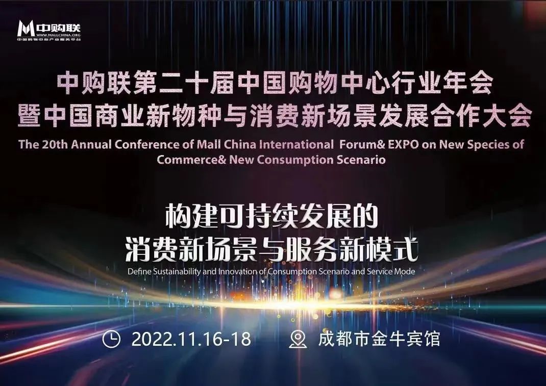 2022年11月16日-18日,以“构建可持续发展的消费新场景与服务新模式”为主题的中购联第二十届中国购物中心行业年会暨中国商业新物种与消费新场景发展合作大会于成都市金牛宾馆盛大召开,众多行业大咖汇聚于此,通过“论坛+展览+品牌洽谈+政府对接交流”等形式,共同探讨全行业的全新发展机遇!