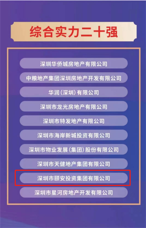 深圳市房地产业协会依据房地产企业纳税金额、销售金额、施工和竣工面积、社会责任等多项维度,从经营业绩、开发后劲、经济实力、社会贡献、品牌价值等多项指标对地产企业进行系统量化研究与评估后,选出综合实力二十强,旨在表彰为深圳城市发展做出巨大贡献、对深圳房地产行业的发展起到引领作用的企业。发布会上,深圳市颐安投资集团有限公司凭借各维度的评价结果,继2020年、2021年后再次荣获“2023年深圳市房地产开发行业综合实力二十强”、“品牌价值企业”荣誉称号。
